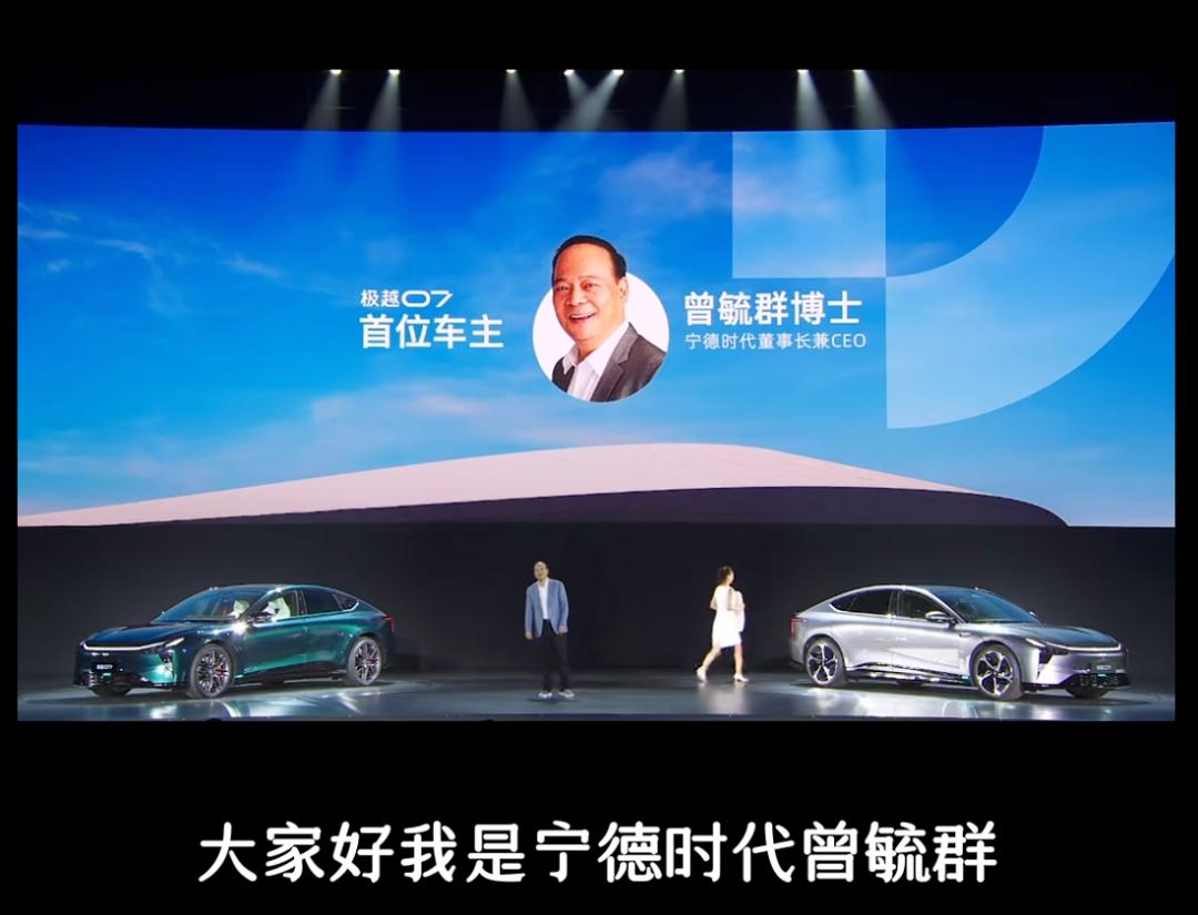宁德时代董事长兼首席执行官曾毓群在舞台上发表演讲,谈到他与李彦宏同年出生,同名“Robin",颇有共鸣。"百度的Robin负责智能化,我的Robin负责电气化",作为极越07电池供应商,他从夏一平手中接过钥匙,成为第一位极越07车主。