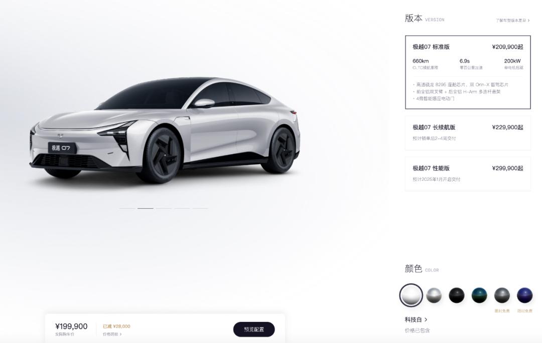 第一次亮相4个多月后,极越07终于正式发布,推出了专业版、长续航版、性能版三款配色车型,包括6种配色,限时优惠价格区间为19.99万元~28.99万元。