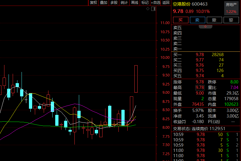 早间房地产表现活跃,板块指数大幅缺口,开盘走高,盘中一度上涨近2%。半天交易接近昨天的全天交易。电子城开盘涨停,空港股权只用了10分钟左右就涨停了,这也是其连续第二个涨停,中交房地产和海泰发展也迅速封板。