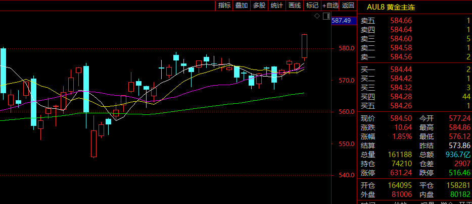 今天,国内黄金期货主力合约也高开高走,截至发稿时,涨幅接近2%,最高达584.86元,接近历史最高点;白金期货主力合约也高达4%以上,最高达7425元。