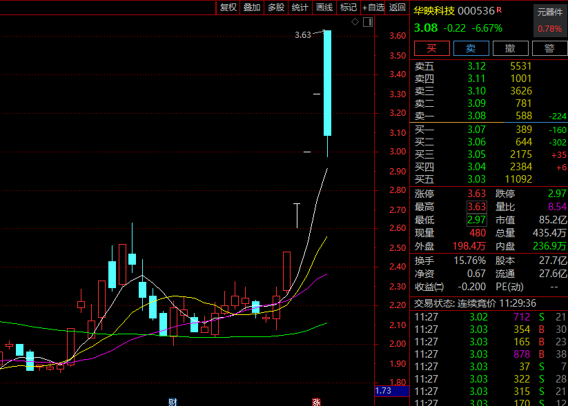今天上午,持续4日涨停的华映科技大幅波动,以日线涨停开盘后瞬间闪崩,盘中一度触及日线跌停,上演天地板市场。 截至中午收盘,下跌6.67%,换手率达到15.76%,成交额超过14亿元。