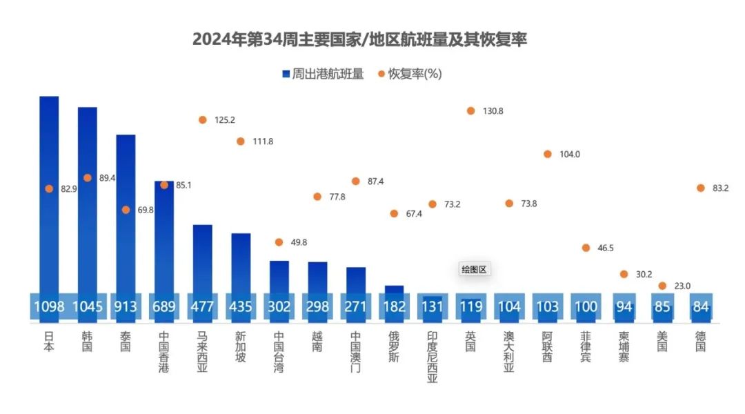 8月底,航班管家向旅游业提供的一项数据显示,自2019年同期以来,马来西亚、新加坡、英国和阿联酋的航班数量已超过2019年同期,其中中国大陆-日本的航班数量居首,恢复率为82.9%。