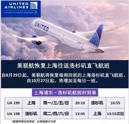 八月二十九日,美国联合航空公司正式恢复了每周四班从洛杉矶和中国上海的直飞航班。