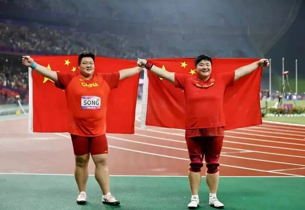 巩立姣(右)和宋佳媛(左)在杭州第19届亚运会田径中获得金牌和银牌。