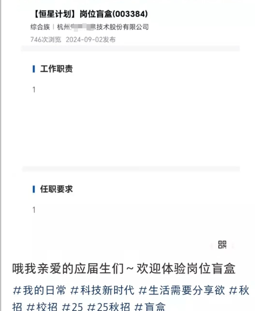 近日,杭州某公司发布的校园招聘信息引起关注,因为设置了“盲盒岗位”,没有提出具体的工作内容和要求。“盲盒还有工资吗?”很多网友开始玩梗,话题也被热搜。