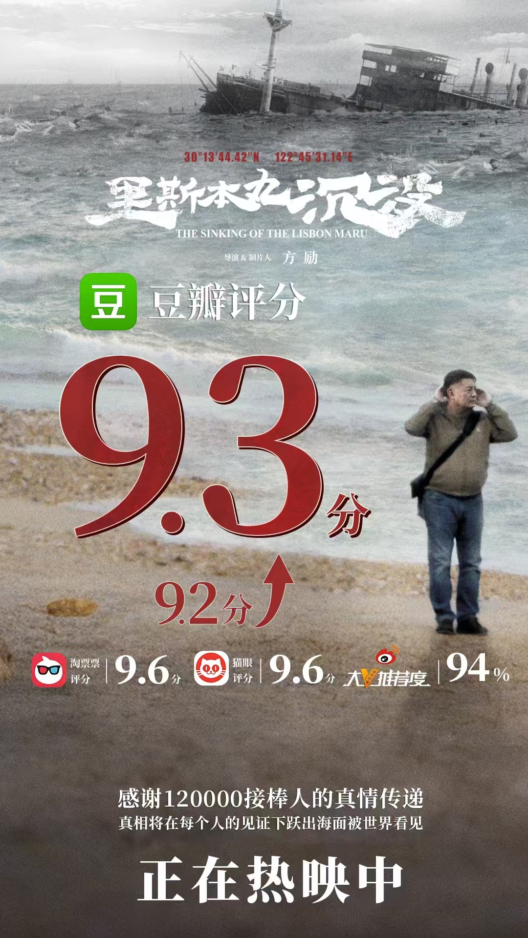 9月12日,《里斯本丸沉没》传来两个好消息——电影票房突破500万元,豆瓣评分从9.2分上升到9.3分。这两个消息接踵而至,有兴趣的人也可以从两张海报上的豆瓣评分看出顺序。