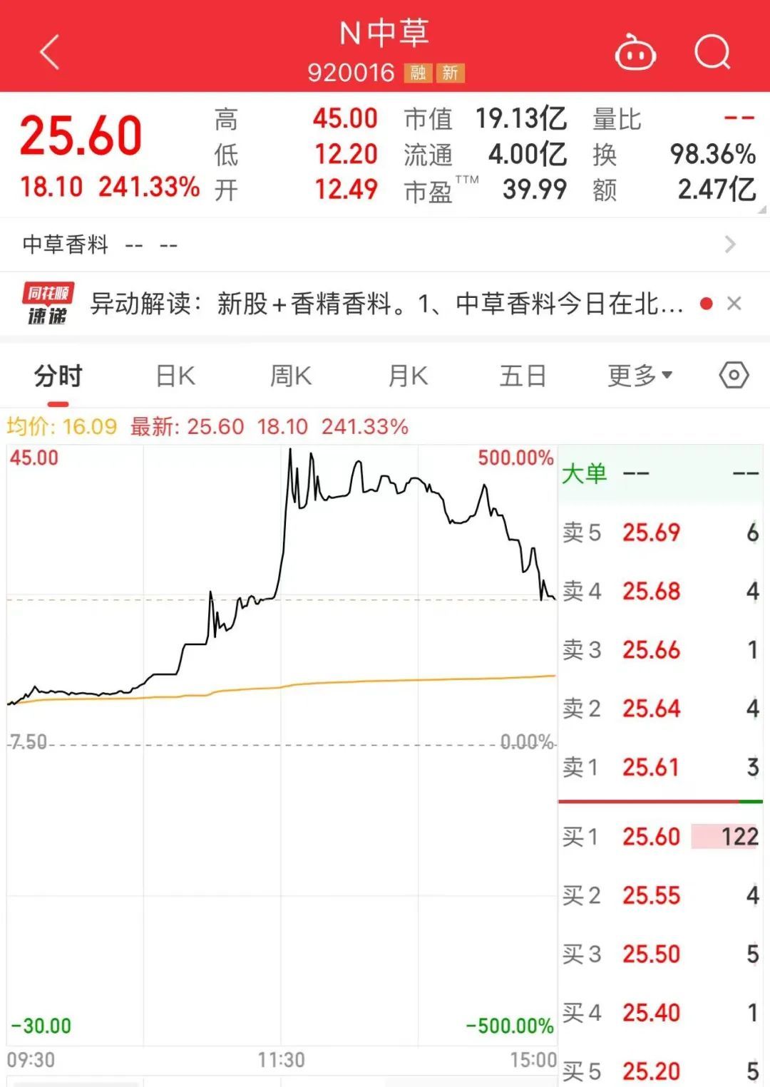 今天,北交所新股N中草(中草香料)开盘后持续上涨,涨幅最高接近500%,盘中两次因涨幅达到限制而触发临停。截至收盘,报25.6元/股,上涨241.33%,日内成交率达98.36%,超过巨能股权,创建a股实施T 1到目前为止,单只股票的日换手率已经达到历史新高。