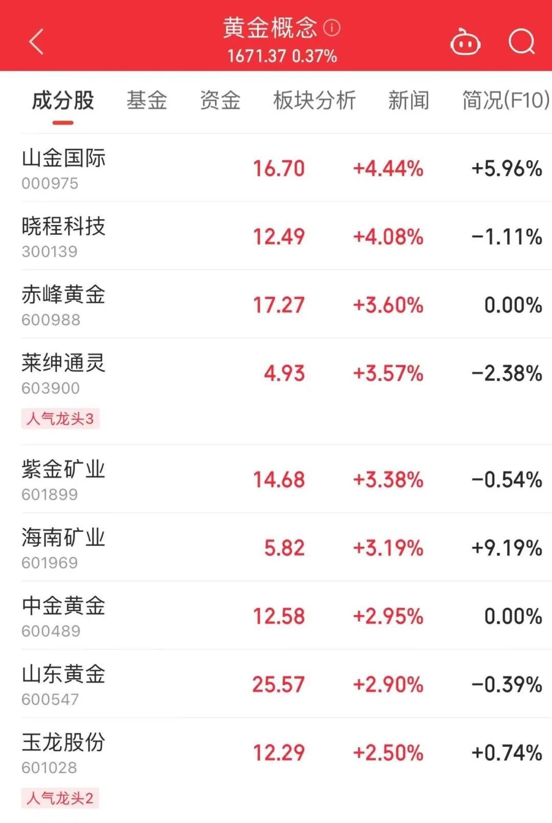 由于现货黄金再创新高,今天多只黄金股上涨。鹏欣资源一字涨停,紫金矿业、山东黄金、中金黄金跟随上涨。