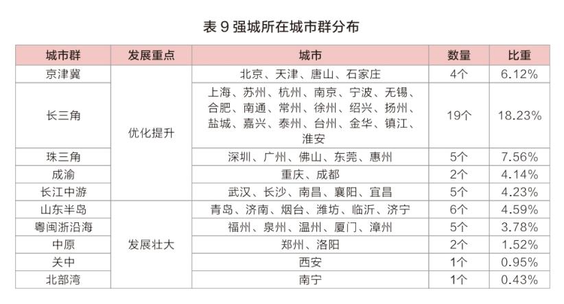 全国59个城市的“强城”入选,长三角占19个,比例高达32.2%,而珠三角只有5个入选。