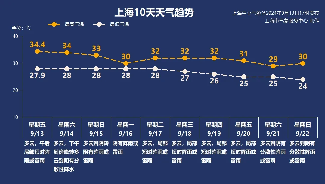 从15日晚到16日,上海将有暴雨到暴雨,部分可以达到120。~180mm,最大小时雨强50mm~70mm的陆地风速9~11级,长江口及临江沿海城市12级~14级,洋山港区13级~15级。中秋节(17日)主要是阴天,部分地区有短时阵雨或雷雨,气温在28~32℃之间。