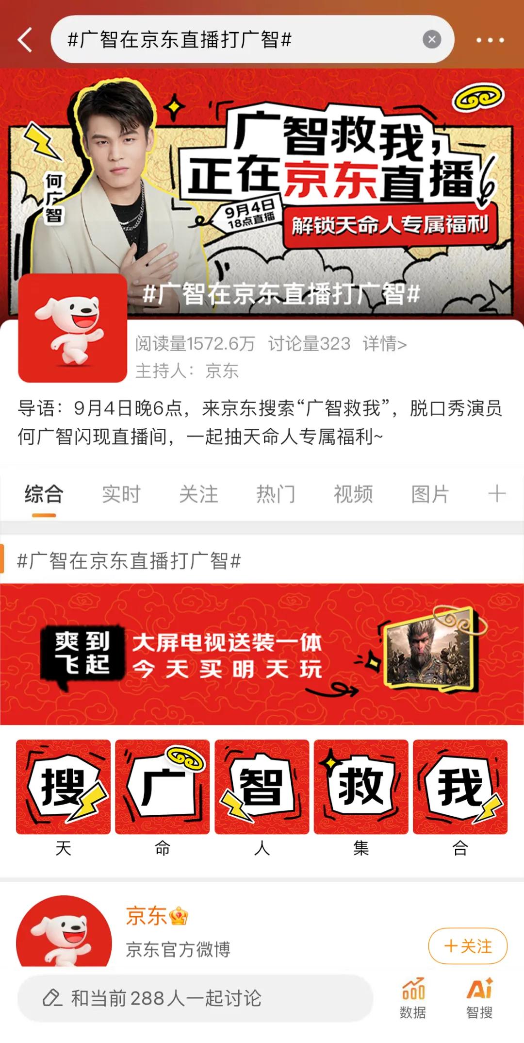 《黑神话:悟空》无疑是今年最热门的现象级话题之一,其中热梗“广智”“广智救我”风靡社交网络。捕捉到这个游戏梗的JD.COM家电迅速响应,邀请脱口秀演员何广智直播“广智”,并在梗中上演了一场带货秀。