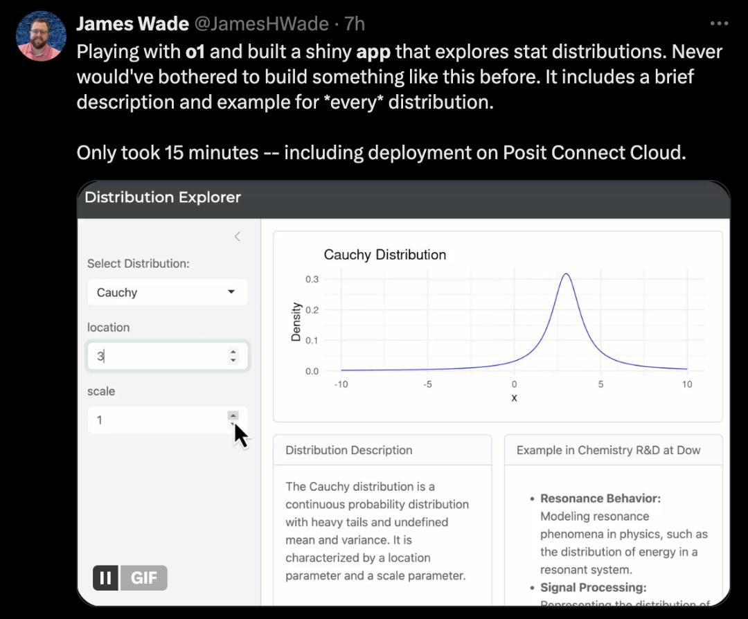 网友@James Wade用o1做了一个数据分析app,可以显示每个分布的简短描述和例子,只用了15分钟,这也包括部署时间。他说:我以前从来没有想过做这样的事情。以前太麻烦了。