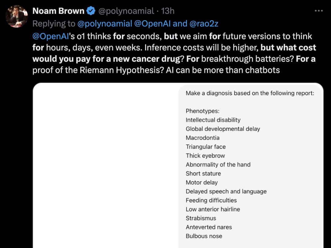 NoamamoopenAI科学家 Brown说,目前o1秒可以给出答案,但未来可以探索几个小时、几天甚至几周。附上一张图片后,o1在探索了十几秒钟后对一个病例进行了诊断。Noam Brown不言而喻,推理时间长,代表着模型可以构建更长的思维链,进行更深层次的思考。