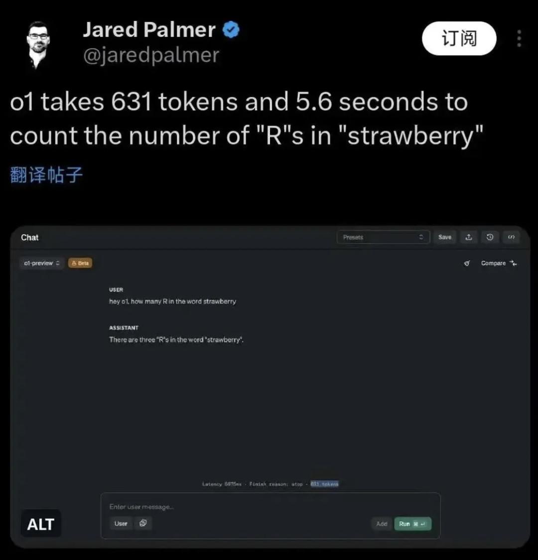 另外一个例子中,o1用5.6秒、631个token回答了简单的问题“straberry里有几个r”。