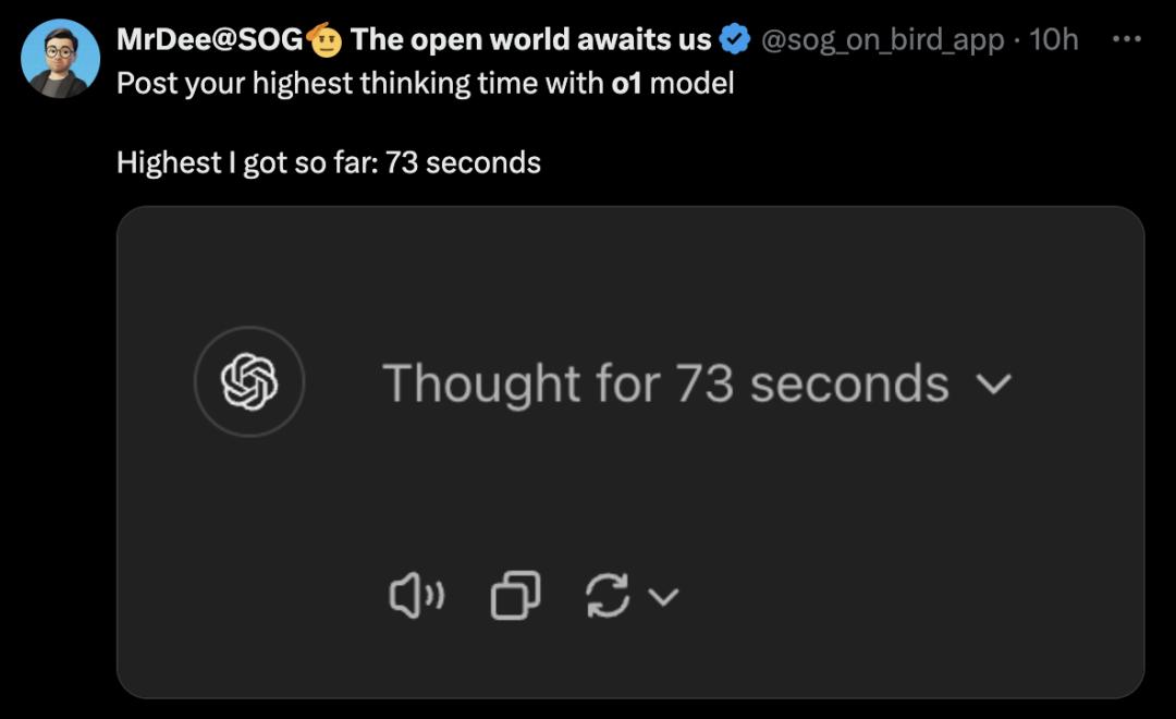 还有更多的人在挑战o1的极限,已经有人玩过“看谁的问题比较棘手,可以让o1思考的时间最长”的游戏。