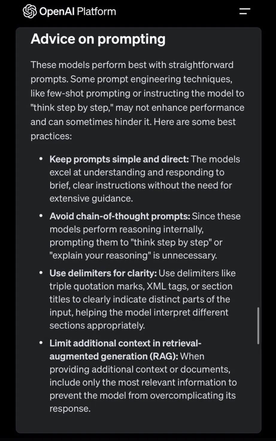 防止思维链在prompts中。o1会自己进行内部推理,所以引导它一步一步地思考和解释你的探索路径是没有用的。