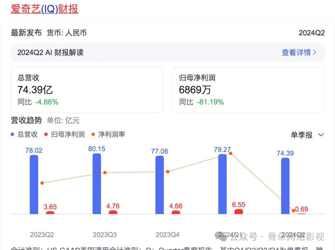 爱奇艺在2024年第一季度的总成本为56亿元,同比下降5%。在这些成本中,内容成本为40亿元,同比下降5%;销售和管理费用、R&D费用分别为9.22亿元和4.29亿元。第二季度,费用为56.78亿元,同比下降2%,其中内容费用为42亿元,同比下降2%。;R&D费用为4.48亿元,同比增长2%。