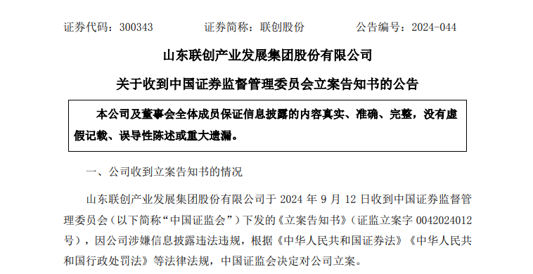 9月13日晚,联创股份(300343)宣布,该公司于9月12日收到中国证监会发布的《立案通知书》。中国证监会决定对该公司立案,因为该公司涉嫌违反信息披露。