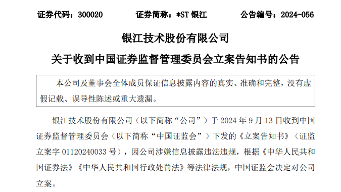 9月13日晚,*ST银江(300020)也宣布收到中国证监会发布的《立案通知书》,证监会决定对公司立案,因为公司涉嫌信息披露违法。但公告并未指出*ST银江因信息披露违法。