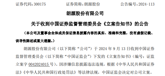 9月13日晚,朗源股份(300175)公告收到中国证监会发布的《立案通知书》。证监会决定对涉嫌违反信息披露法律法规的公司立案。