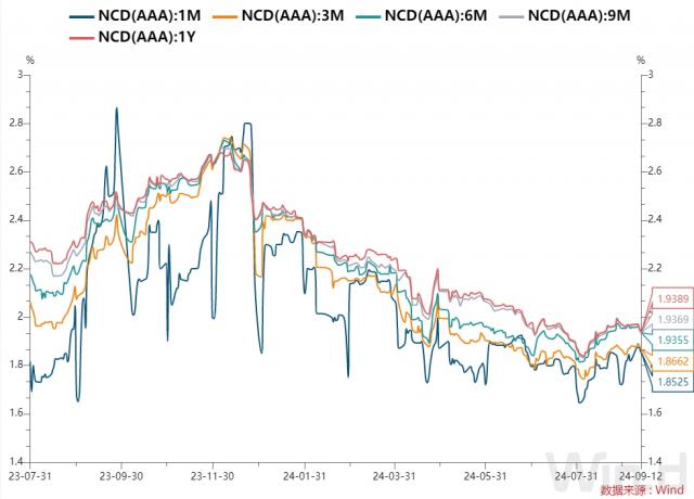 国有和主要股份制银行一年期同业存单二级最新交易在一年期 1.935% 周围环境,较上日下降 2bp。