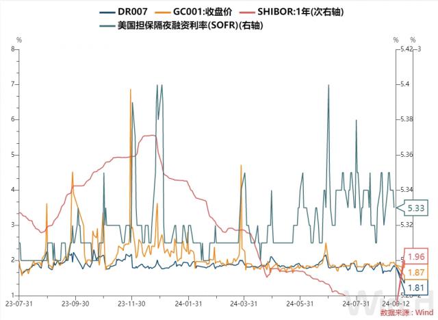 周四银行间市场资金供需暂时平衡,存款隔夜回购加权利率保持在一夜之间。 1.8% 下面,变化不大。在海外,美国最新的隔夜融资担保利率是 5.33%。