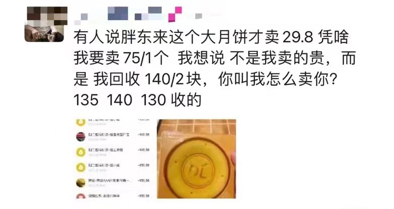 而且针对月饼代购价格高的情况,有黄牛说:“不是我卖的贵,而是我回收了140/2块,你叫我怎么卖你?”