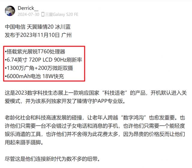 谈起来,真情实感 20 并非中国电信推出的第一款长辈手机,在此之前,它还推出了天翼一号,并迭代了不止一款。