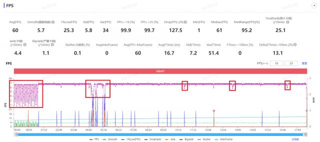 实际测量王者荣耀的画质选择超清晰,帧率选择高,一开始画面变化很大。但一旦系统恢复,此时处于高负荷场景,性能调度调整到电子竞技模式,画面基本可以稳定。 60fps 上下,只有团战时帧率才会下降一些: