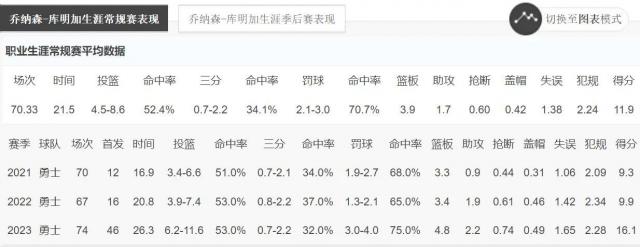2023-24 这个赛季,库明加取得了显著进步。平均每场比赛。 26.3 分钟,获得 16.1 分 4.8 篮板 2.2 助攻 0.7 断球 0.5 盖帽 1.6 错误,三个准确率:52.9%,32.1%,74.6%。但中距离跳投不好,准确率只有 38.9%的距离篮筐。 5 到 9 英寸距离,准确率只有英寸, 40%。