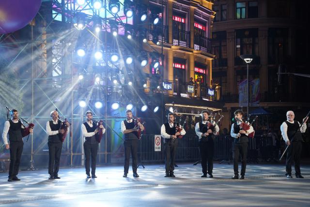 在正式演出中,法国洛里昂风笛乐队期待着精彩的演奏。