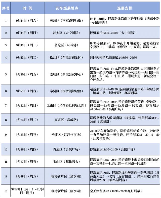 剧透先到这儿来 ~ 更多开幕大戏,还请关注明晚开幕大巡游哦!如果不能去现场看也没关系。开幕式巡游结束后,花车团队将前往黄浦、静安、普陀、松江、崇明、奉贤、金山、嘉定、杨浦、青浦、宝山、临港新区等。 12 一个地区巡展,活动总公里数约为 1800 与更多的市民朋友一起走进上海旅游节的“美好与快乐”公里。