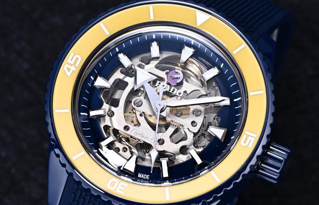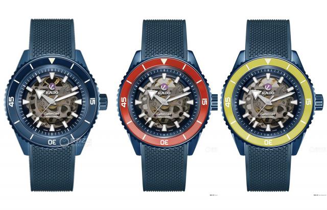 每一种颜色在生活中似乎都被赋予了一个角色,深蓝色受到更多男性的喜爱,所以很多品牌都会推出蓝色,瑞士雷达手表今年 8 月发布了 3 只有彩色高科技瓷表,以蓝色为基础,黄色和红色作为表圈,尽显青春时尚。