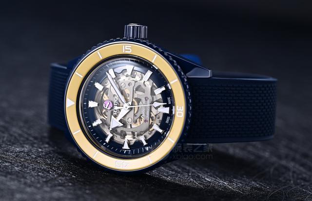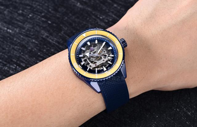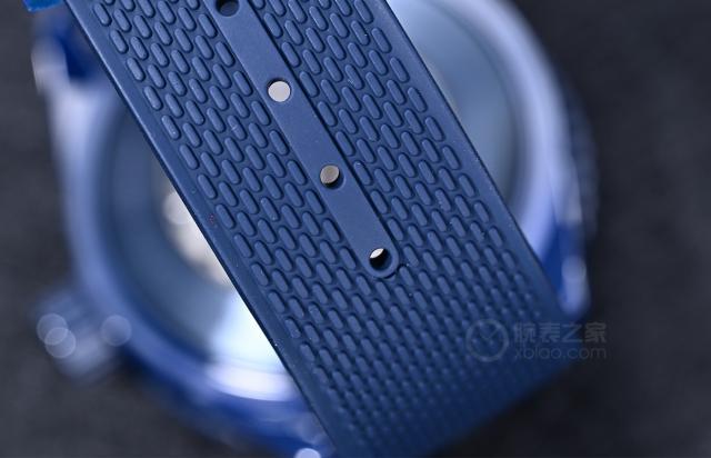 手表配有哑光海军蓝橡胶表带和抛光海军蓝高科技瓷扣。这些小细节可以为佩戴者提供舒适的使用空间。