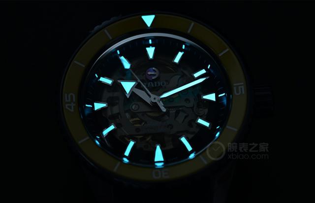 盘面每 5 漆面时标、时针和分钟 12 所有点的三角形标志都涂有白色 Super--LumiNova ® 夜光镀层。当光线较暗时,表盘上的夜光效果可以为佩戴者提供清晰的读时功能。