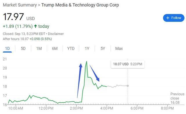 美东时间9月13日星期五,Trump是特朗普的主要媒体公司。 Media & Technology Group(DJT)(以下简称特朗普媒体)股价在盘中瞬间暴涨。不到半个小时,盘中涨幅从略超过1%迅速扩大到近30%,随后迅速下跌,20分钟内涨幅过半,最终收于11.8%左右。