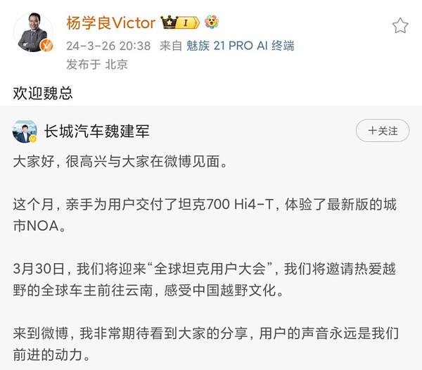 杨学良与魏建军的互动已经不是第一次了。今年 3 经过多年的魏建军回归微博,杨学良也在第一时间转发了自己的微博,并欢迎魏总的回归,可见他对汽车圈的前辈还是有足够的尊重的。