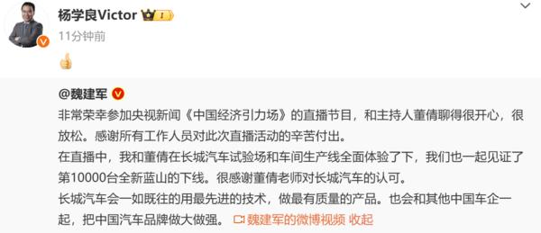 魏建军在微博上写道:“很荣幸能参加央视新闻《中国经济引力场》的直播节目,与主持人董倩聊得很开心,也很放松。感谢所有工作人员对这次直播活动的辛勤付出。在直播间,我和董倩在长城汽车试验场和车间生产线上有了全面的感受,我们也见证了第一次。 10000 台湾新蓝山下线。非常感谢董倩老师对长城汽车的肯定。长城汽车将一如既往地利用最先进的技术,做出最优质的商品。还将与其它中国汽车公司一起,发展壮大中国汽车品牌。"