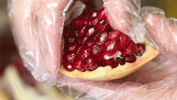 只要在石榴顶上画出六边形,然后把顶部掰下来,找出夹层切开,最后用力一掰就露出里面的红色如玛瑙果。