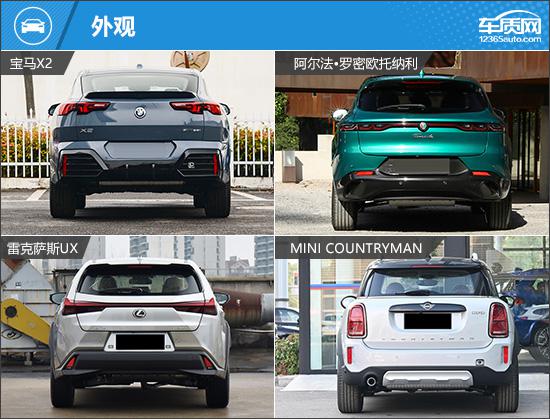 车尾部分,四款车均采用家族式设计,整体辨识度较高。雷克萨斯是其中之一 UX 和阿尔法 · 目前流行的罗密欧托纳利尾灯组采用贯穿式设计,既能增加层次感,又能拉申视觉宽度。MINI COUNTRYMAN 选用品牌经典的“米”字尾灯,不但辨识度极高,而且增加了车尾的厚重感。宝马 X2 采用全新造型的尾灯组,配合上尾和下扩散器的设计,展现出强烈的运动感。