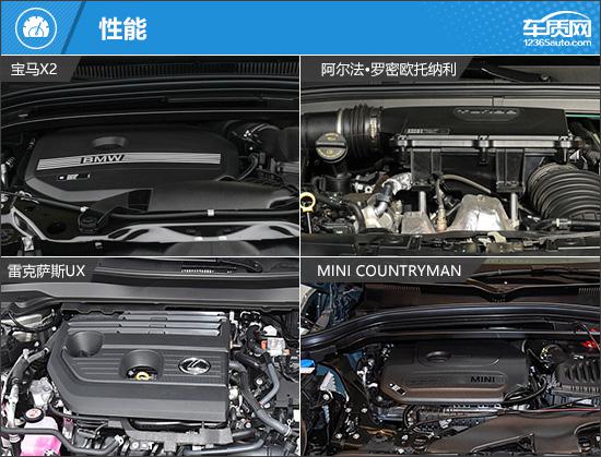 动力方面,除了雷克萨斯 UX 除油电混合动力外,其它车型的能源类型均为汽油。就参数而言,阿尔法 · 最大功率和最大扭矩优势明显的罗密欧托纳利发动机,官方 0-100km/h 在四款车中,加速是最好的。与此同时,它还配备了全时四驱系统,具有更好的动态稳定性。相比之下,MINI COUNTRYMAN 不如其他三款车型,虽然它配备了适时的四驱系统,但是官方 0-100km/h 在四款车中,加速仍然是最差的,而且 1.5T 引擎也采用了很多国内消费者不满意的三缸设计。