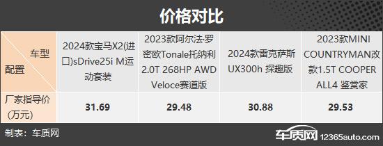 这次选择的四款车分别是 2024 款宝马 X2(进口)(以下简称:宝马 X2)、2023 款阿尔法 · 罗密欧 Tonale 托纳利(以下简称:阿尔法 · 罗密欧托纳利)、2024 款雷克萨斯 UX(以下简称:雷克萨斯 UX)以及 2023 款 MINI COUNTRYMAN(以下称:MINI COUNTRYMAN),四款车都定位紧凑 SUV。在价格方面,尽管宝马 X2 官方价格门槛超过 30 一万元,但是如果考虑到经销商的优惠,实际售价可以低到一万元。 30 一万元以内(因为现在照片数量少,所以有些车型的照片并不是相应的具体款式)。