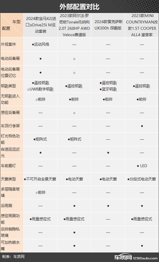 宝马是外部配置 X2 它是四款车中唯一标配的电动后备箱和电动后备箱位置记忆车型。阿尔法 · 罗密欧托纳利依靠独特的后侧隐私玻璃,提高了后排乘客的隐私。相比之下,雷克萨斯 UX 配置水平略低,还有提升空间。