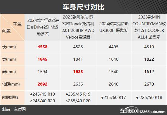 就车身长度而言,四款车均定位紧凑。 SUV,给人一种小巧精致的视觉效果。宝马参数方面 X2 在车身长度、宽度和轴距方面占优势,车内乘坐空间性能更好;阿尔法 · 在车身高度上,罗密欧托纳利是最好的。