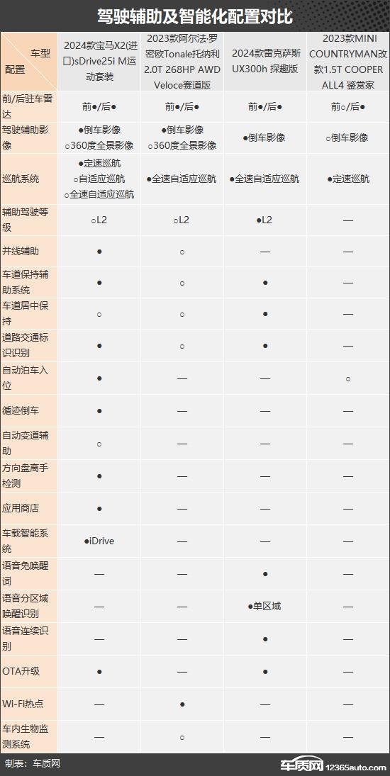 驾驶硬件方面,除 MINI COUNTRYMAN 另外,三款车型都标配倒车影像和前驻车雷达,宝马 X2 和阿尔法 · 罗密欧托纳利也可以选择 360 度过全景图像。在驾驶功能方面,雷克萨斯 UX 标配 L2 驾驶辅助系统。宝马 X2 尽管需要加价选择自动巡航或全速自动巡航,但是在四款车中独享循迹倒车,方向盘离手检查。相比之下,MINI COUNTRYMAN 其它三款车型在驾驶功能配置上都不如拉胯。