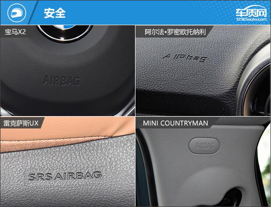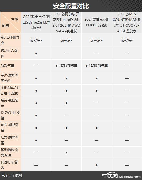 阿尔法安全配置 · 雷克萨斯和罗密欧托纳利 UX 全部配备主驾膝气囊,能有效减少事故发生时对人体的伤害。不仅如此,雷克萨斯 UX 还配备了后侧气囊,安全性更高。主动性安全,宝马 X2 表现更好,独享 DOW 开门警告,后方碰撞警告。相比之下,MINI COUNTRYMAN 主动式安全配备拉胯,配备缺失较多,与其它三款车型拉开明显差距。