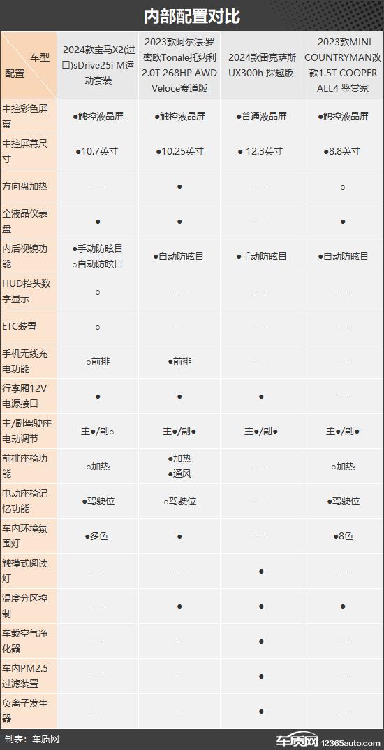 阿尔法内部配置 · 罗密欧托纳利在舒适性配置方面表现最好,独家方向盘加热,前排座椅通风;同时,它的液晶仪表尺寸也是四款车中最大的。相比之下,宝马 X2 内部装备性能差,装备缺失较多,与其它三款车型存在一定差距。