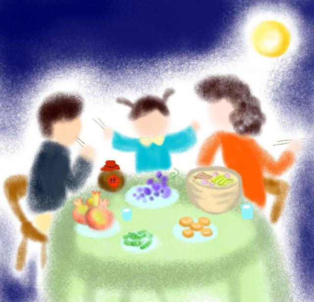 那晚一家人要聚在一张桌子上吃团圆饭。饭后一起欣赏窗边的明月,与李白的“举杯邀明月,对影成三人”相比,要温暖得多。