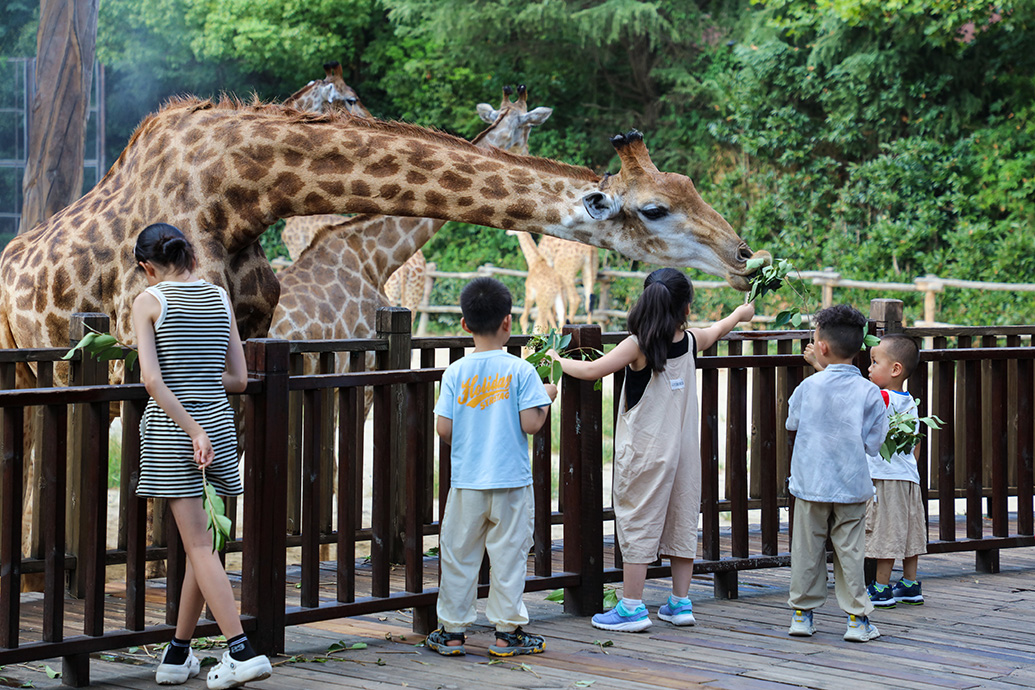 上海野生动物园6月龄出生高1.8米,长颈鹿“石头”与游客见面。