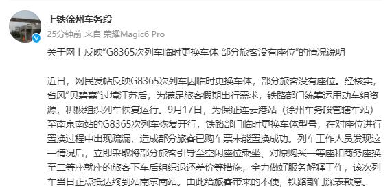 最近,网友发帖反映 G8365 由于车身临时更换,部分乘客没有座位。经核实,台风“贝碧嘉”进入江苏后,铁路部门统筹利用动车组资源,积极组织列车恢复运行,以满足旅客假期出行需求。9 月 17 日本,为确保连云港站(徐州车务段管辖车站)到南京南站 G8365 第二列火车恢复运行,铁路部临时更换车身型号,在更换座位时遇到疏漏,导致部分旅客已购票未能成功更换。列车工作人员发现这一情况后,立即采取措施,引导部分乘客乘坐空闲座位,组织原购买一等座位和商务座位换乘二等座位的乘客下车后退还差价,全力解释服务。列车当天正点到达南京南站。铁路部门为给乘客带来的不便道歉。